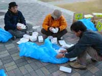 リサイクル容器(P&P容器)の使用・回収の呼びかけ 昨年に引き続き、摂津際でリサイクル容器(P&P容器)の使用と回収の呼びかけに参加しました。この運動は学際模擬店実施委員会、学生会館実施委員会、文化会常任委員会、体育会本部、生協学生委員会、谷口ゼミが協力して企画しました。リサイクル容器は丼型(大・小)、トレー型(大・中・小)の5種類が使われました。今回は回収された容器を各模擬店にリサイクル可能かをチェックしてもらうことで、店側の人たちにもリサイクルの重要性を理解してもらえたかと思います。4日間で24,100個の容器が使用され、全体の35,6%が回収されました。今年は昨年に比べて回収率が約5%上がりました。これは摂津際に参加した人々の環境意識が向上したと言えるのではないでしょうか。 |