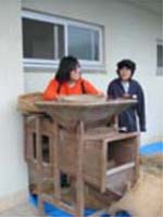ゴミと米を分ける作業は、きれいにわけようとすると手間や時間が思ったよりもかかり、苦労しました。とうみ(風を利用したゴミと米を分別する機械)を使うとかなり早く効率よく進み、昔の人の目のつけどころと、それをある材料で作るという器用さに改めて感心しました。私たちが普段、主食として食べている米が茶碗にもられるまでの過程を、苗植えから脱穀までではありますが経験することができ、その難しさ、苦労、楽しさ、喜びなどを学ぶことができてよかったと思います。 |